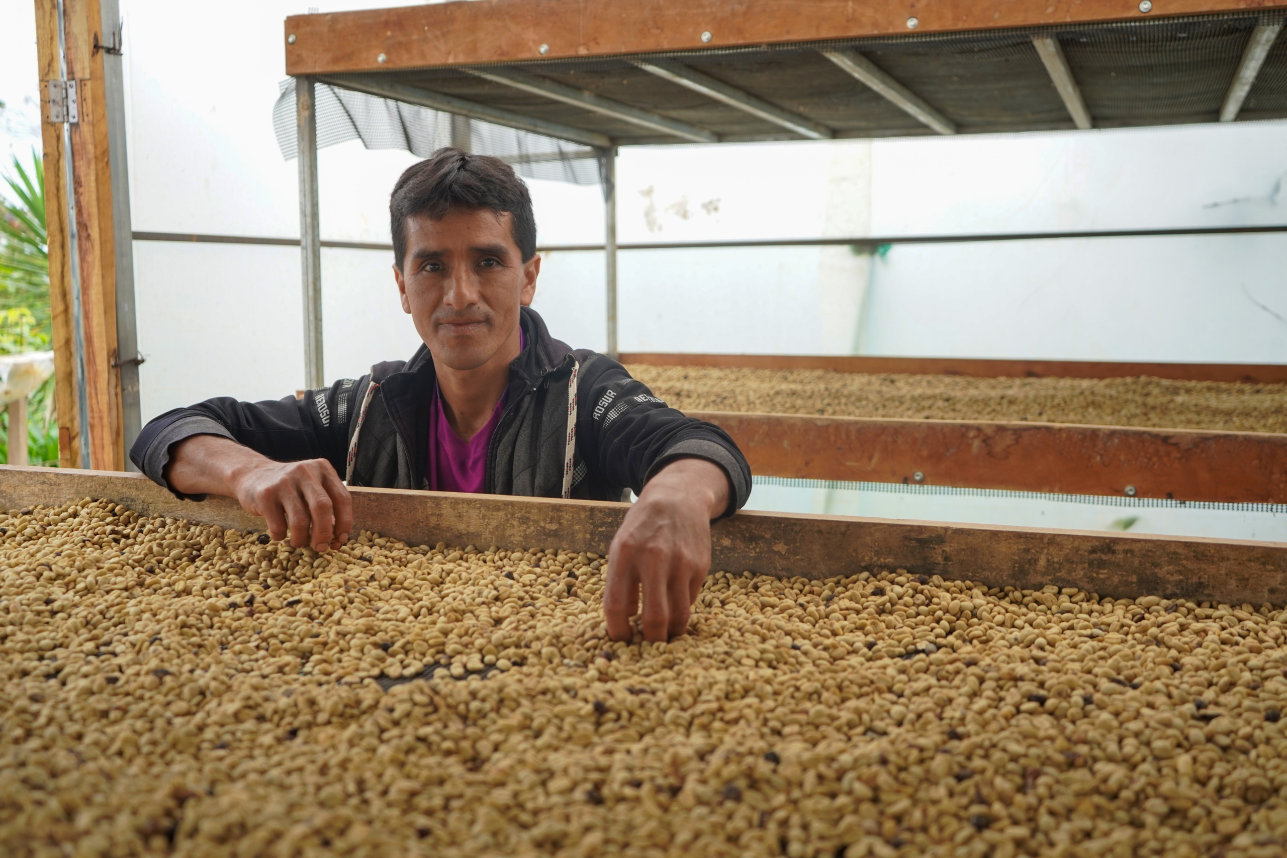 An Aprocassi producer shows off his drying beds.